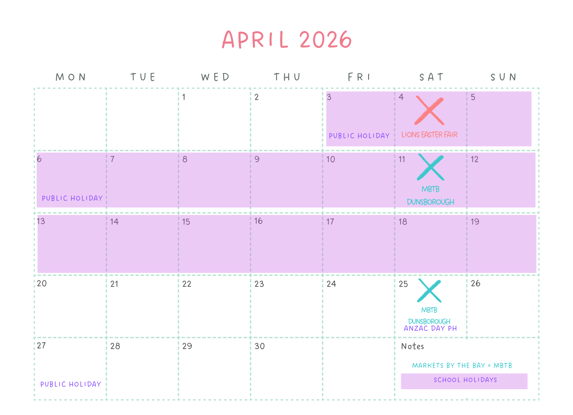 PLEASE NOTE: OUR MARKETS BY THE BAY (MBTB) DATES ARE MARKED WITH A BLUE X. WE DO NOT RUN THE LIONS MARKETS. PLEASE CONTACT TIM DIRECTLY TO BOOK A SPACE AT THEIR DATES (MARKED IN RED). tmorgan88@bigpond.com